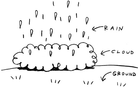 Karen spoke first. “It’s raining up from the ground,” she said confidently and without hesitation. She motioned with her paws to demonstrate how the water rose up from the ground. “I believe somehow a small storm cloud has crashed into the earth in that yard. During the crash, it flipped over and is now raining up instead of down.”
