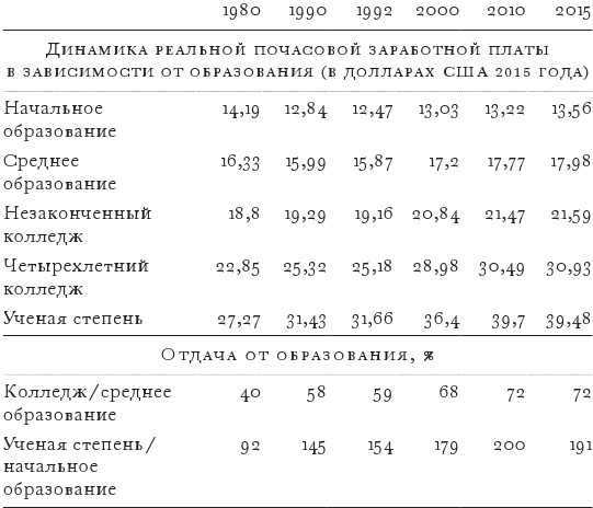 Наряду с замедлением экономического роста за последние сорок лет возросло неравенство. Выражаясь в общих чертах, неравенство доходов может расти между средним классом и бедными или между богатыми и средним классом. Как выясняется, может происходить и то и другое, но не всегда одновременно. В 1970-е и 1980-е годы мы наблюдали в основном рост неравенства между средним классом и бедными. Это неравенство идет рука об руку с разрывом в заработной плате между выпускниками колледжей и теми, кто не имеет высшего образования, фактором, известным как отдача на высшее образование.