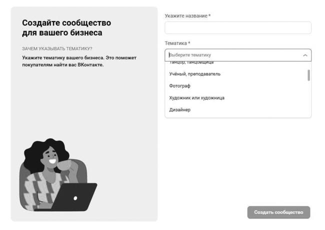 Шаг 3. Заполняем тематику и описание сообщества.