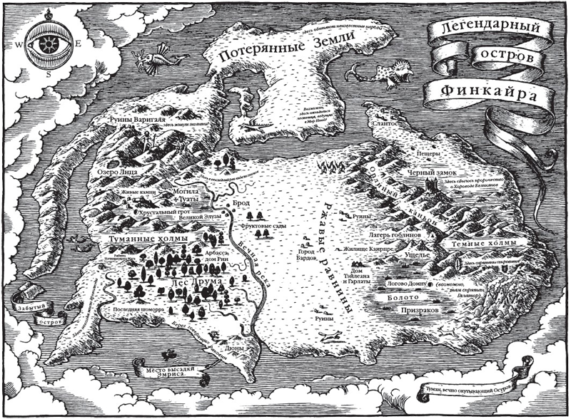В промежутке между этими двумя эпизодами происходит немало событий. Мерлин обнаруживает у себя дар ясновидения, «второго зрения», однако за этот дар ему приходится дорого заплатить. Он учится разговаривать с животными, деревьями, реками. Он находит настоящий Стоунхендж, гораздо более древний, чем круг из камней на равнине Солсбери, возведение которого приписывается ему в легенде. Но сначала он должен узнать, что означает название Стоунхенджа на языке друидов – «Хоровод Великанов». Он исследует свой первый хрустальный грот. Совершает путешествие на затерянный в океане остров Финкайра (на гэльском языке – Fianchuivé); в кельтских мифах это остров, лежащий под поверхностью моря, мост между Землей, принадлежащей людям, и Миром Иным, где обитают духи и божества. Он встречается с существами, имена которых известны нам из древних сказаний – великим Дагдой[13], злым Рита Гавром[14], несчастной Элен[15], загадочной Домну[16], мудрым Каирпре[17] и жизнерадостной Рией. Он также знакомится с другими, менее знаменитыми жителями острова – Шимом, Стангмаром, Тэйлеаном, Гарлатой и Великой Элузой. Он многое узнает на волшебном острове. Например, для того, чтобы видеть мир таким, каков он есть, недостаточно человеческого зрения; истинная мудрость часто объединяет противоположные качества, например, веру и сомнение, мужское и женское начала, свет и тьму; настоящая любовь приносит как радость, так и горе. И самое главное – он получает имя «Мерлин».