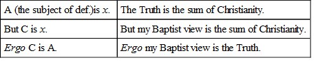 Every definition is a syllogism. Now, because the minor proposition is constantly false, this does not affect the case; each man is right to fill up the minor with his own view, and essentially they do not disagree with each other.