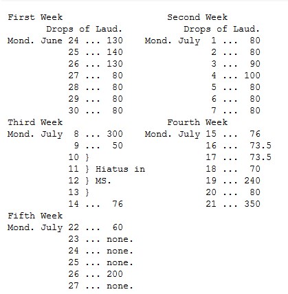 On which last notice I would remark that mine was too rapid, and the suffering therefore needlessly aggravated; or rather, perhaps, it was not sufficiently continuous and equably graduated. But that the reader may judge for himself, and above all that the Opium-eater, who is preparing to retire from business, may have every sort of information before him, I subjoin my diary:—