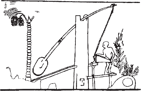 Шадуф (рис. 12), как правило, делается из двух столбов высотой 1,5 метра или выше, соединенных в верхней части короткой балкой (коромыслом). Сверху устанавливается длинный балансирующий шест, на одном конце которого крепится сосуд для воды, а на другом – противовес. Человек окунает сосуд в воду, поднимает его и выливает воду в оросительный канал. С помощью такого устройства в день можно поднять около 2 тысяч литров воды на высоту 2 метра. Позднее шадуфы располагались рядами; при этом все шадуфы, за исключением первого, окунали сосуды в специальное корыто, заполненное водой из предыдущего шадуфа. Их первым серьезным соперником стала непрерывная цепь ковшей – по-видимому, ее использовали для подъема воды из колодца под известными Висячими садами Семирамиды. Водяное колесо, приводимое в движение волом, с помощью которого орошали пол-акра земли в день, появилось только в 200 году до н. э., когда при помощи зубчатой передачи соединили вертикальный и горизонтальный валы колеса.