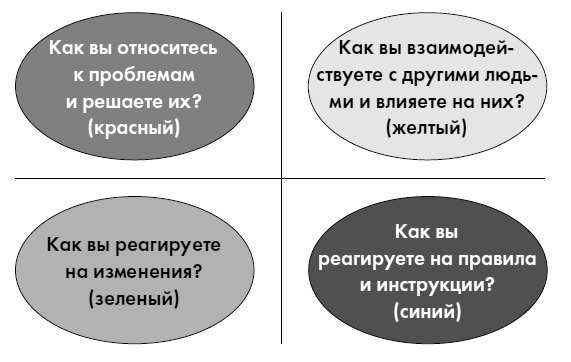 Для простоты объяснения этих четырех типов поведения мы будем использовать цвета психологической модели Лушера. Именно отсюда мы взяли красный, желтый, зеленый и синий. Красный – это цвет огня, желтый – цвет воздуха, зеленый – это земля, а синий – море. Хорошо, и что же это значит?