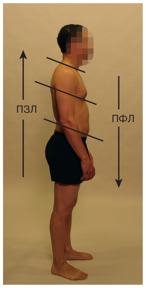 Рис. 4.5. Очень распространенный паттерн – ПФЛ стянута вниз по передней стороне тела, а ПЗЛ поднята вверх по задней стороне тела (обозначено вертикальными линиями). Это создает перекос между фасциальными пластами в передней и задней частях тела, который обозначен горизонтальными линиями. Работа с таким смещением фасциальных пластов является относительно новой концепцией в тренировках и в работе с телом, которая отличается от привычной концепции сильных и слабых мышц или идеи об укороченной и удлиненной миофасции. Все перечисленные проблемы также будут сопровождать данный паттерн, но если ничего не предпринять для выравнивания самого «игрового поля», то есть не работать со смещением пластов, мышечный дисбаланс будет возникать снова и снова