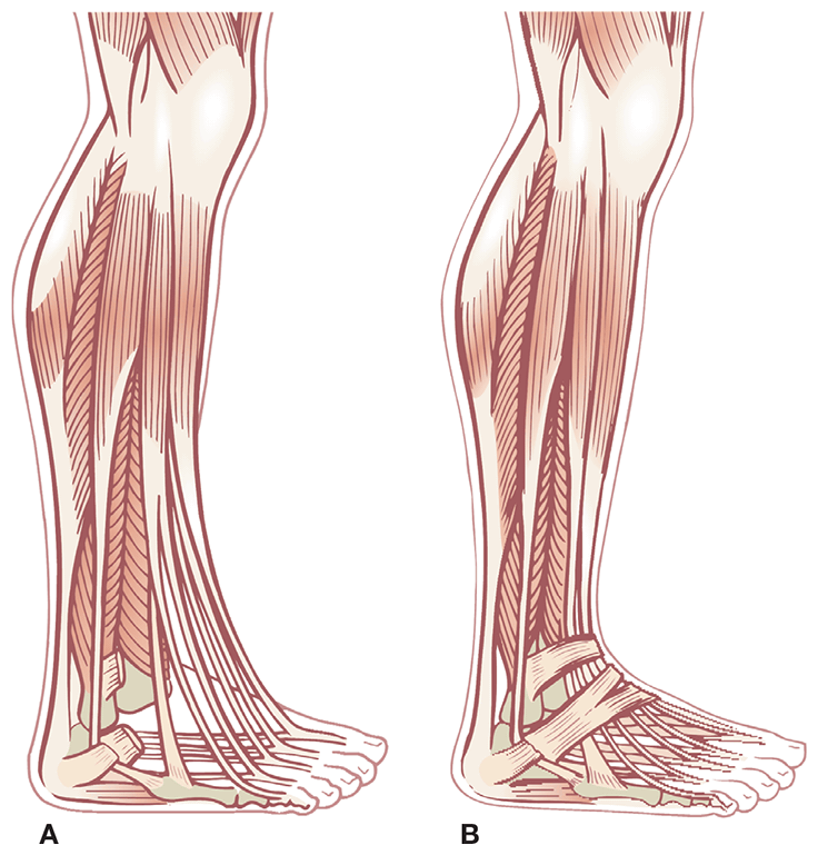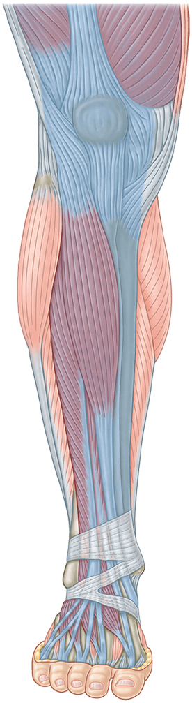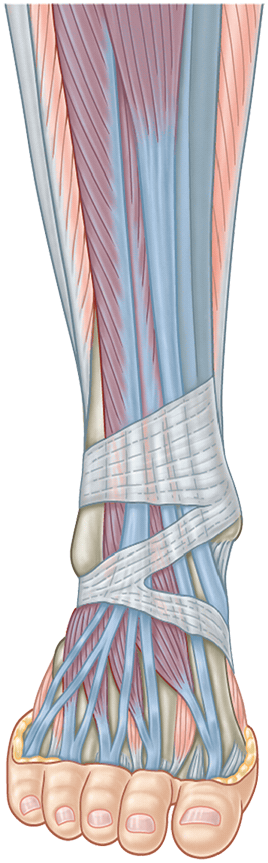 Рис. 4.9. Удерживатели – это уплотнения в глубокой фасции голени. Они удерживают сухожилия ПФЛ и направляют усилие, проходящее от мышц передней части голени к пальцам стопы. Эта область насыщена проприоцепторами