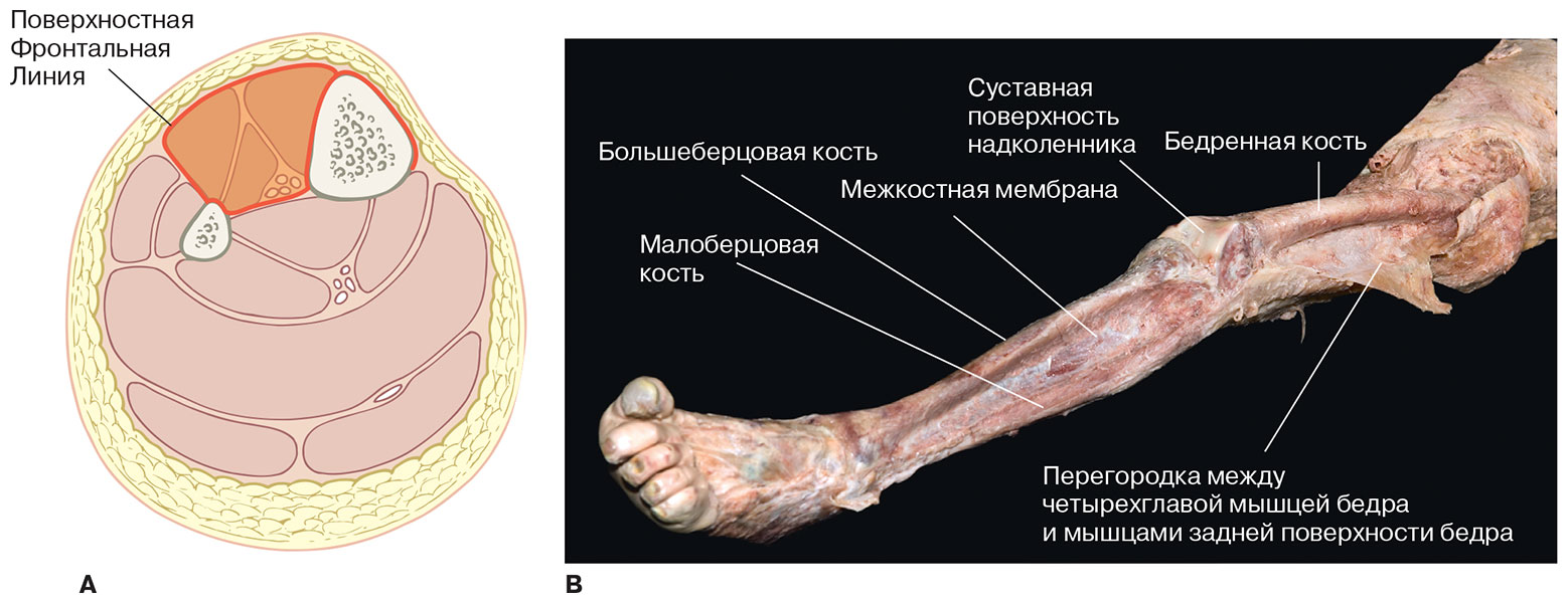 Рис. 4.10. ПФЛ включает в себя передний отдел голени, а также ткани передней части большеберцовой кости. На рисунке (В) мы видим, как мало тканей ноги остается, если удалить все структуры ПФЛ. Мы можем увидеть межкостную мембрану под тем местом, где был передний отдел голени; бедренная кость также будет почти полностью обнажена, если убрать четырехглавую мышцу бедра. На рис. 2.1С представлена диссекция обеих частей фасции голени – передний отдел и поверхностная фасция, покрывающая большеберцовую кость. Отверстия в фасции, вероятнее всего, образовались вследствие полученной человеком травмы голени (например, при игре в футбол или падении со ступенек), в результате чего фасция голени прилипла к пролегающей под ней надкостнице