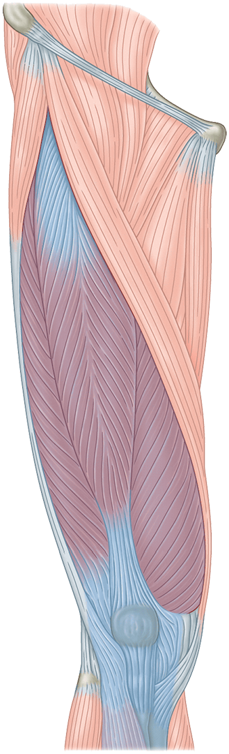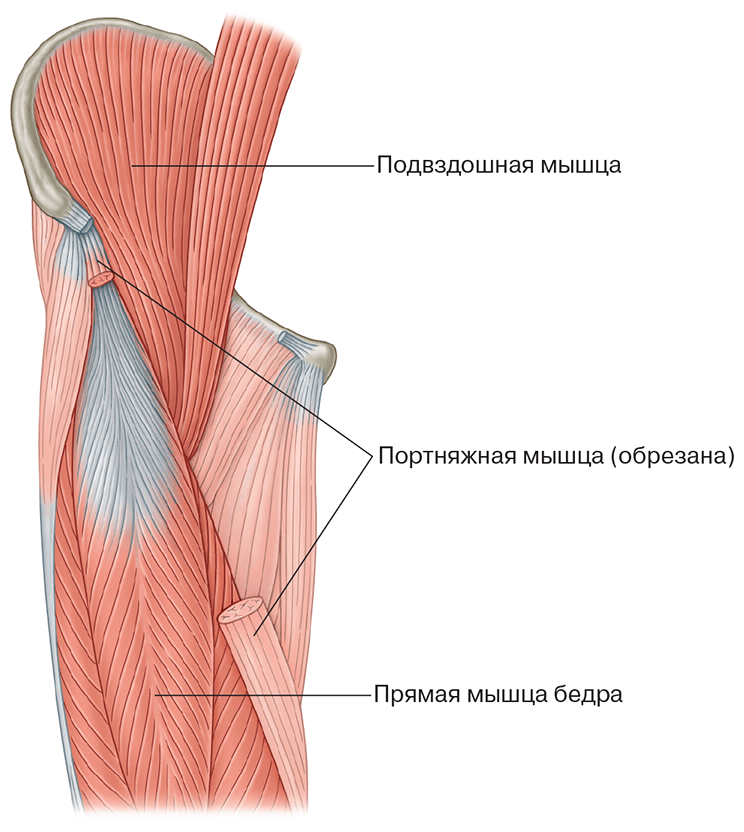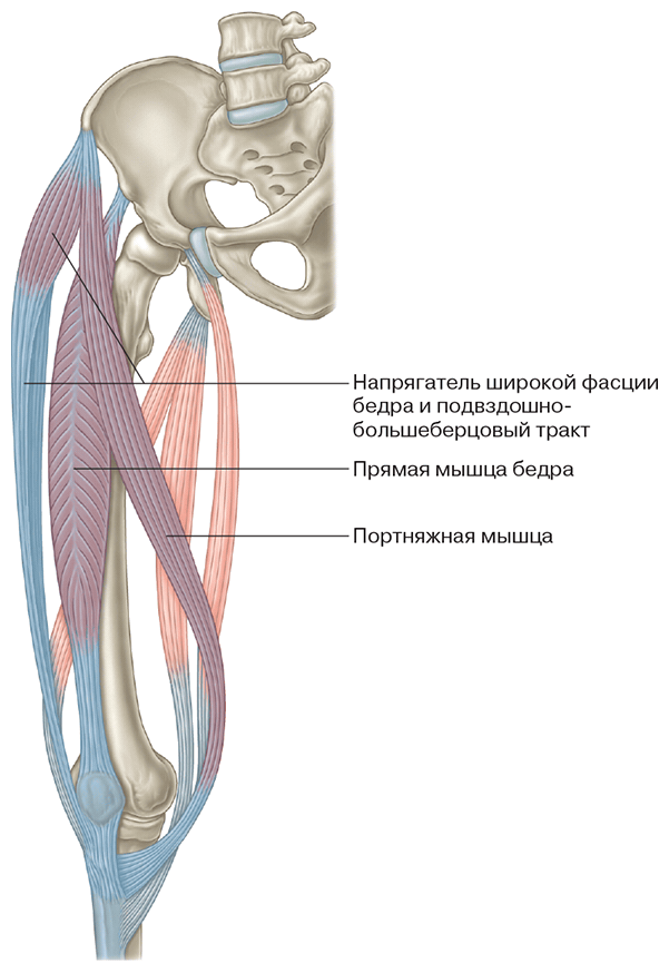 Рис. 4.12. Можно сказать, что функционально ПФЛ включает в себя все головки четырехглавой мышцы бедра. Но при более строгом рассмотрении мы будем говорить лишь о части этой группы, прямой мышце бедра, проходящей вверх к передней нижней подвздошной ости