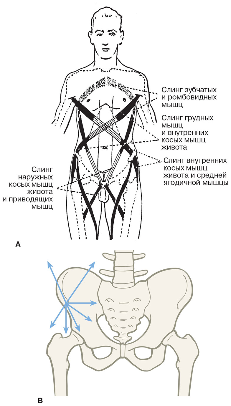 Рис. 4.17. (А) Движения, которые происходят исключительно в сагиттальной плоскости (сгибание-разгибание), задействуют всю ПФЛ целиком. (В) Ротационные движения в области таза и туловища отделяют верхнюю часть ПФЛ от нижней
