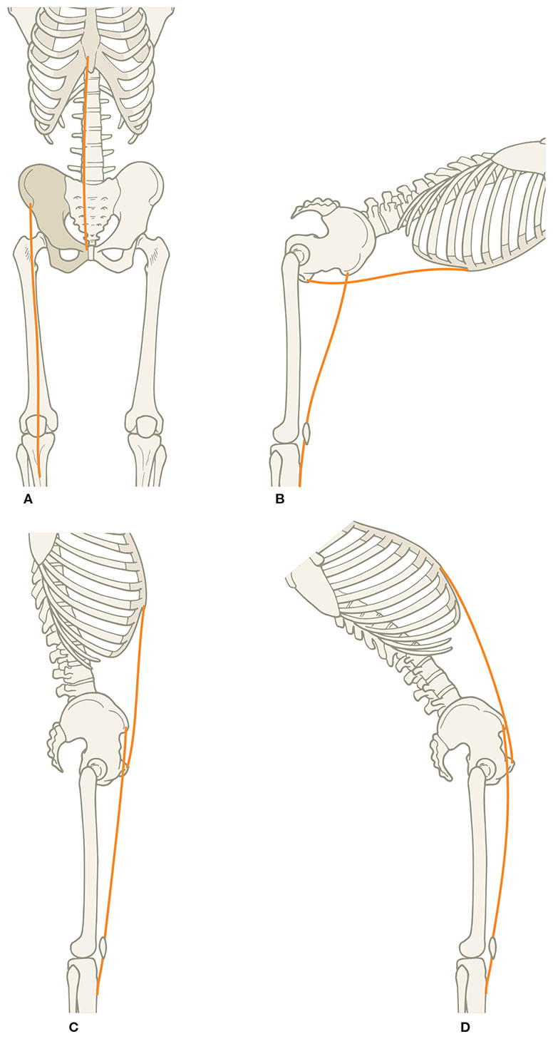 Рис. 4.16. (А) Прямая мышца бедра и прямая мышца живота механически связаны через каждую из тазовых костей. (В) Если обе мышцы сокращаются, происходит сгибание туловища и сгибание в тазобедренном суставе, сближающие грудную клетку и колено. (С) В положении стоя относительный тонус мышц поможет определить наклон таза. (D) При разгибании обе мышцы растягиваются в направлении друг от друга – если одна из них не эластична, то другая должна это компенсировать или передать напряжение вверх или вниз по ПФЛ. Хотя такое разделение делит ПФЛ на два участка, они механически связаны во всех движениях сгибания и разгибания туловища и тазобедренного сустава