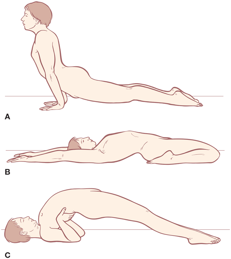 • Растяжка «кобра» – это простой способ растянуть участок ПФЛ от пальцев ног до живота (рис. 4.25A). Помните о голове: при переразгибании шеи растяжению области живота будет противодействовать укорочение ГКСм. Удерживайте голову высоко поднятой, а взгляд направьте вперед.