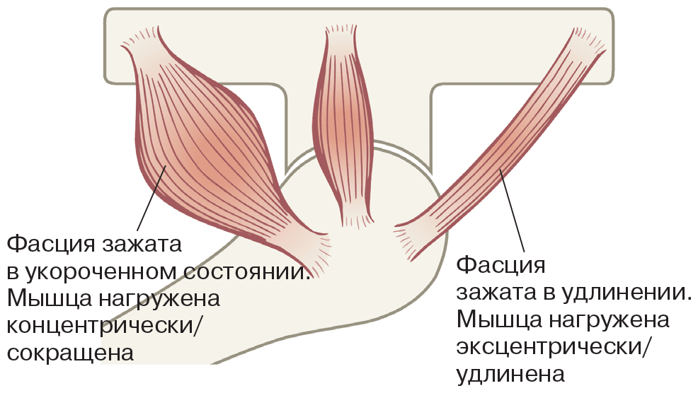 Рис. 4.29. В мышцах, находящихся в эксцентрическом удлинении, нередко возникают болезненные ощущения и появляются активные триггерные точки; однако для коррекции этого паттерна необходимо освобождать и растягивать мышцы, зажатые в укороченном состоянии, которые, казалось бы, не беспокоят клиента