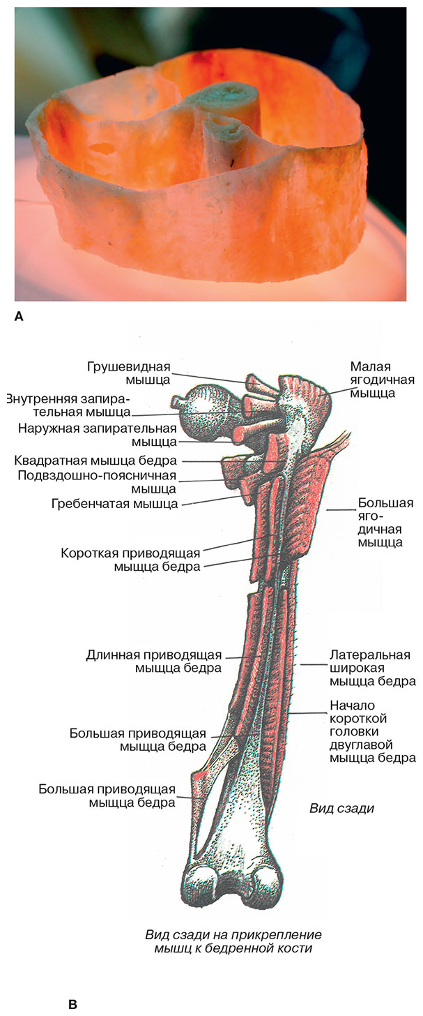 Рис. 5.10. (А) Латеральная межмышечная перегородка продолжается подвздошно-большеберцовым трактом, широкой фасцией бедра и слоем эпимизия, покрывающим двуглавую мышцу бедра и латеральную широкую мышцу бедра. (В) Эта перегородка подходит к шероховатой линии, проходя сзади от бедренной кости прямо между головкой двуглавой мышцы бедра и латеральной широкой мышцей бедра (В, изображение John Hull Grundy)