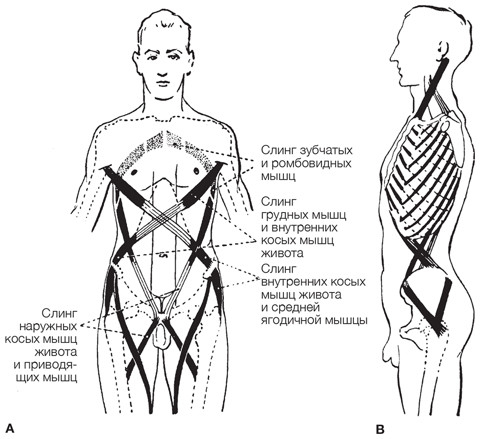 Косые мышцы живота прикрепляются к нижним ребрам. Отсюда «путь» может проходить вверх как по самим ребрам, так и по мышцам между ними. Боковая часть (около 60°) грудной клетки имеет аналогичный перекрестный рисунок миофасций: наружные межреберные мышцы идут назад и вверх, а внутренние межреберные мышцы – вперед и вверх. Межреберные мышцы проходят под мышцами плечевого пояса и формируют такой же рисунок по всей длине грудной клетки вплоть до первых ребер в нижней части шеи (см. рис. 5.11В).