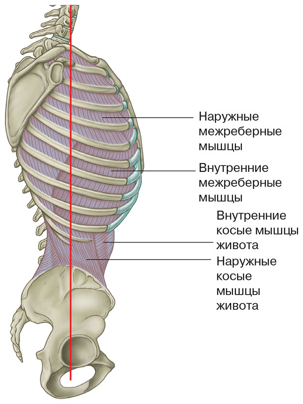 Рис. 5.12. Мышцы живота образуют большой «Х» на боковой части талии, который продолжается малыми «Х» межреберных мышц. Вместе они образуют линию, проходящую вверх по боковой части туловища