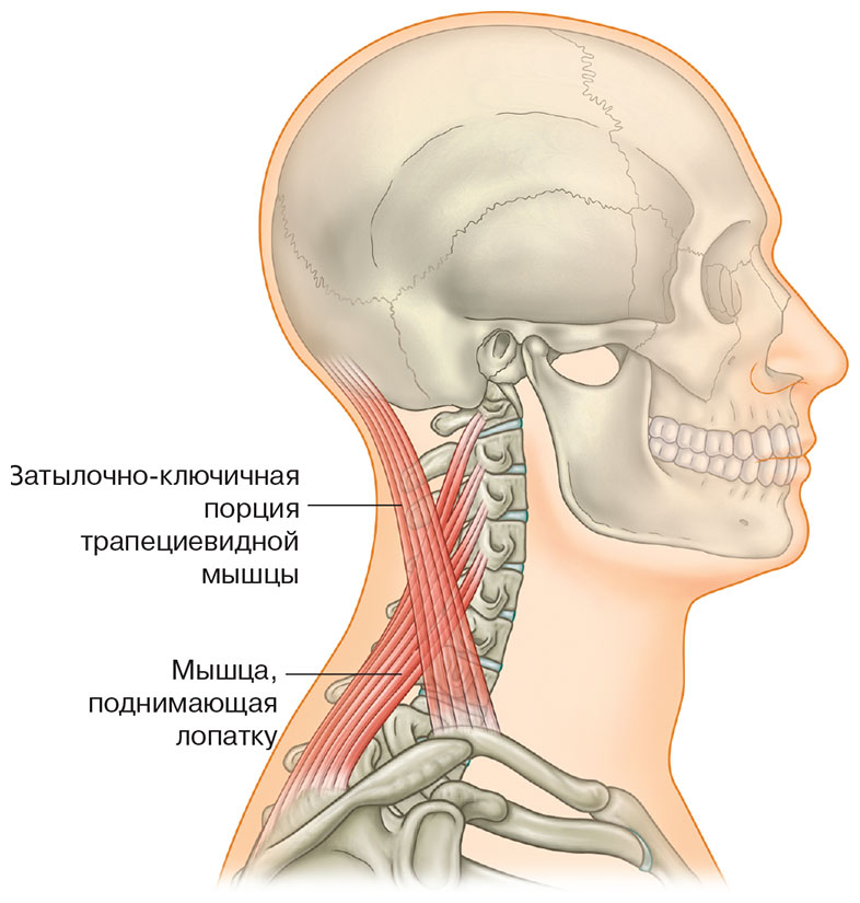 Рис. 5.14. Может создаться впечатление, что мышца, поднимающая лопатку, выполняет те же функции, что и ременная мышца головы, и тоже является частью Латеральной Линии. Однако это типичная «ошибка», которую иногда допускает тело, подключая плечевой пояс в работу по стабилизации туловища. Аналогичным образом грудино-ключично-сосцевидная мышца «ошибочно» берет на себя функцию передней порции трапециевидной мышцы