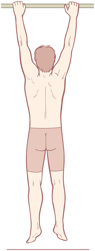 Рис. 5.16. Помимо простого осмотра тела спереди или сзади попросите своего клиента повиснуть на турнике. Это даст вам еще одну прекрасную возможность увидеть основные паттерны дисбаланса в двух Латеральных Линиях