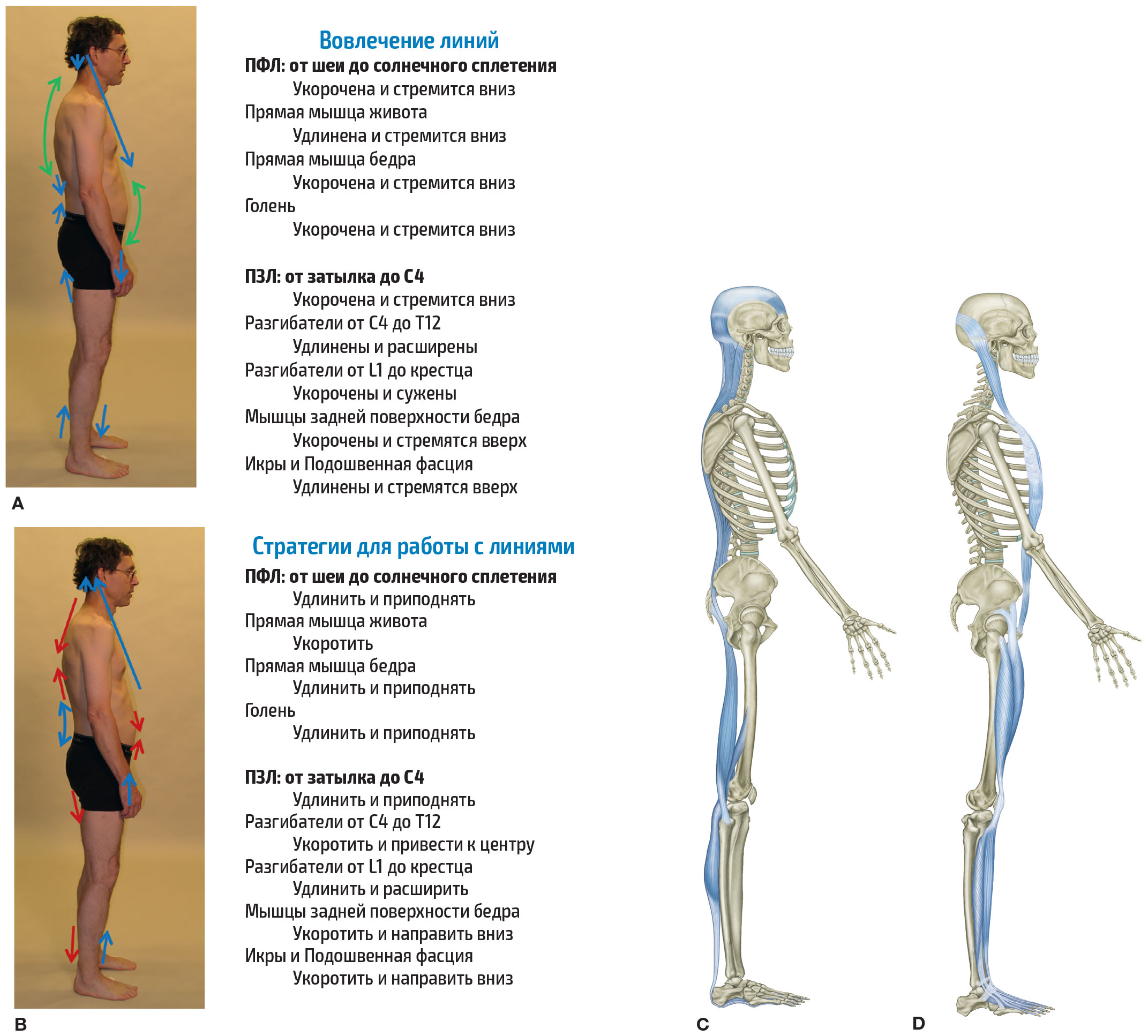 Рис. 1.2. Анализ укорочения или ослабления внутри каждого изображенного миофасциального меридиана и рассмотрение их взаимосвязей с другими меридианами приводит к созданию стратегий работы со всем телом. Эти стратегии направленны на улучшение осанки и двигательной функции. (A) Вид сбоку показывает нам взаимодействие только между Поверхностной Задней Линией (рис. С) и Поверхностной Фронтальной Линией (рис. D). На рисунке A изображена простая диаграмма направления в фасциальных плоскостях, а также области вероятного гипер- и гипотонуса в сагиттальной плоскости. (B) Схема стратегии по исправлению паттерна с помощью миофасциальных манипуляций и обучения движению