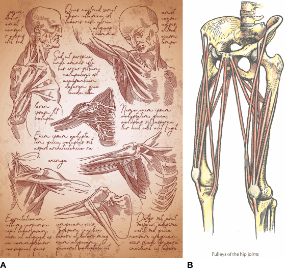 Рис. 1.4. (А) Леонардо да Винчи, свободный от предрассудков механистической точки зрения на «кости-мышцы», присущей тому времени, нарисовал в своих тетрадях удивительно похожие на «Анатомические поезда» фигуры. (В) Некоторые современные анатомы, такие как, например, восхитительный Джон Халл Гранди, также применили системное мышление к скелетно-мышечной анатомии. (A, Леонардо да Винчи / Shutterstock. B, воспроизведено с любезного разрешения Гранди, 1982 г.)
