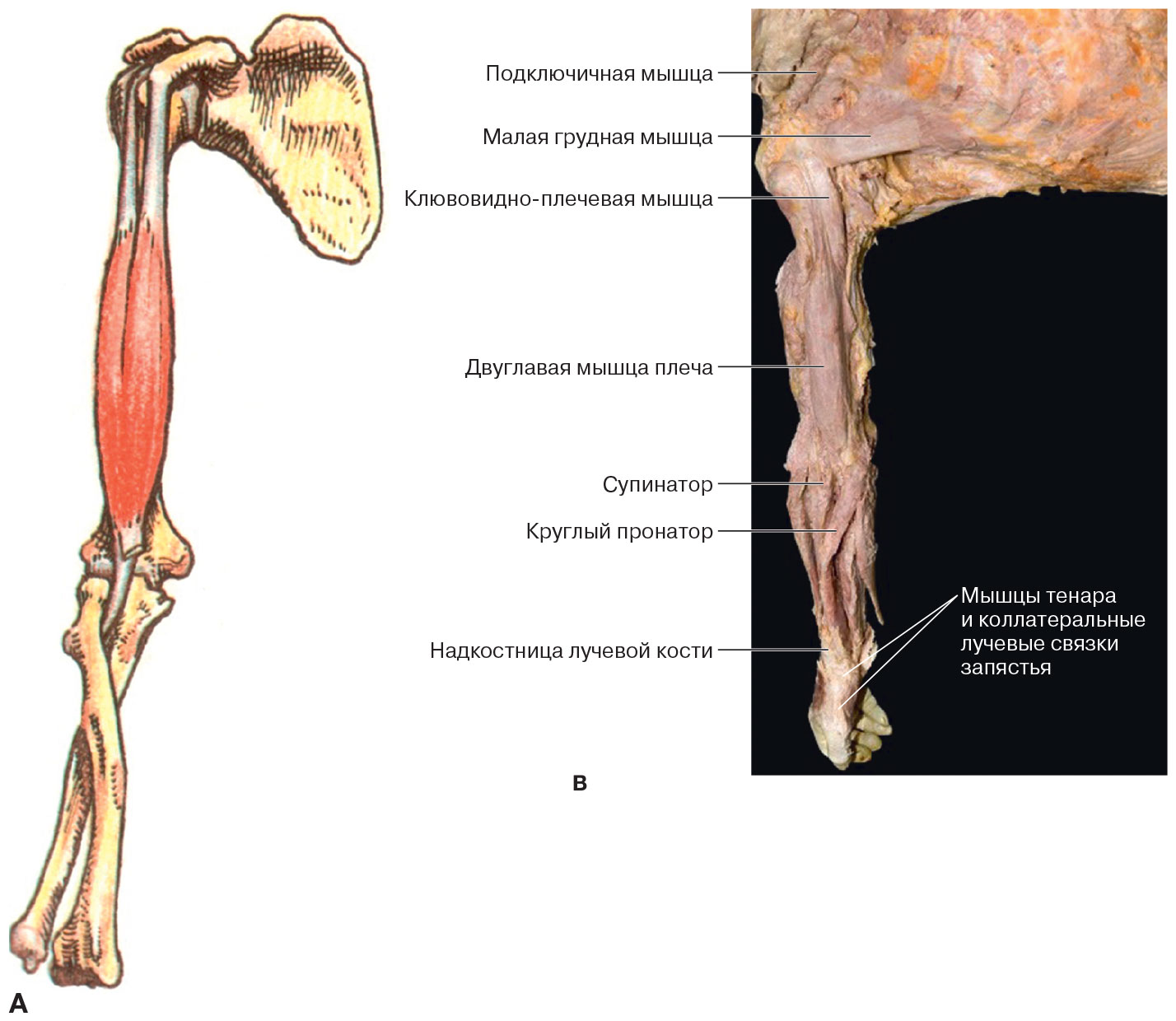 Рис. 1.6. Традиционно считается, что отдельные мышцы выполняют определенную функцию или движение. Анализ их действия заключается в изолировании одной мышцы скелета (на данном изображении – двуглавой мышцы плеча) и наблюдении за тем, что произойдет, если сблизятся два ее конца. И хотя это очень полезное упражнение, его вряд ли можно считать достаточным, поскольку оно не учитывает воздействие данной мышцы на соседние мышцы и связки. Воздействие происходит за счет натяжения фасции смежных с ней мышц. Это запускает передачу усилия от мышцы к мышце, за счет их натяжения или расталкивания. Кроме того, при обрезании фасции на любом из ее концов мы отменяем влияние, которое ее натяжение оказывает на проксимальные или дистальные структуры за ее пределами. Именно этим упомянутым выше связям посвящена данная книга. (В) Двуглавую мышцу плеча также можно рассматривать как часть миофасциальной непрерывности, проходящей от осевого скелета до большого пальца руки, и называемой здесь Глубинной Фронтальной Линией руки (см. также Рис. 7.1). (Рис. (A) – воспроизведен с любезного разрешения из Grundy 1982 г;. Рис. (В) – фото любезно предоставлено автором.)