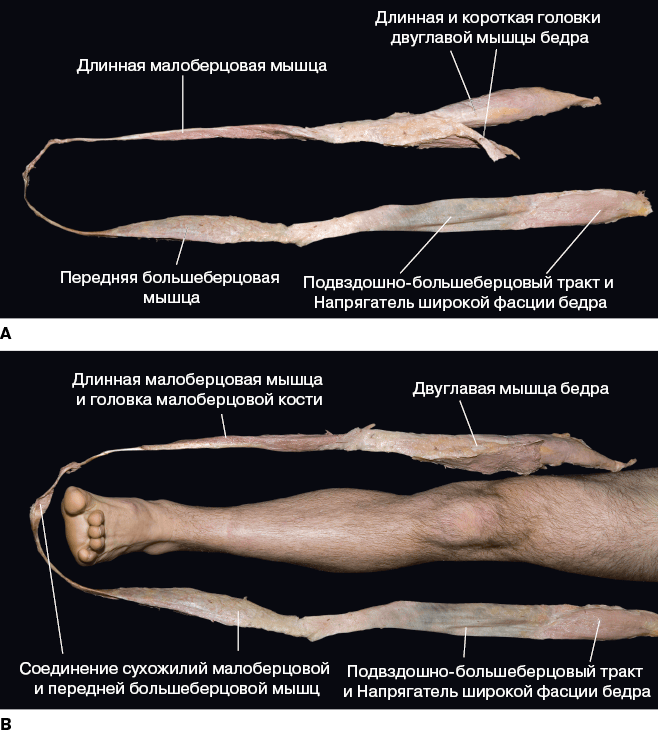 Иногда воздействие миофасции на окружающих ее «соседей» описывается подробнее. Примером может служить латеральная широкая мышца бедра. Она играет роль «гидравлического усилителя», который увеличивает давление на подвздошно-большеберцовый тракт и тем самым создает в нем преднатяжение. Фактически, подобное гидравлическое усиление происходит постоянно во всем теле (см. Обсуждение тенсегрити в Приложении 1). Несмотря на это, почти никогда не упоминаются продольные связи между мышцами и фасциями или их функции (как, например, постоянная связь между подвздошно-большеберцовым трактом и передней большеберцовой мышцей – см. рис. 1.7).
