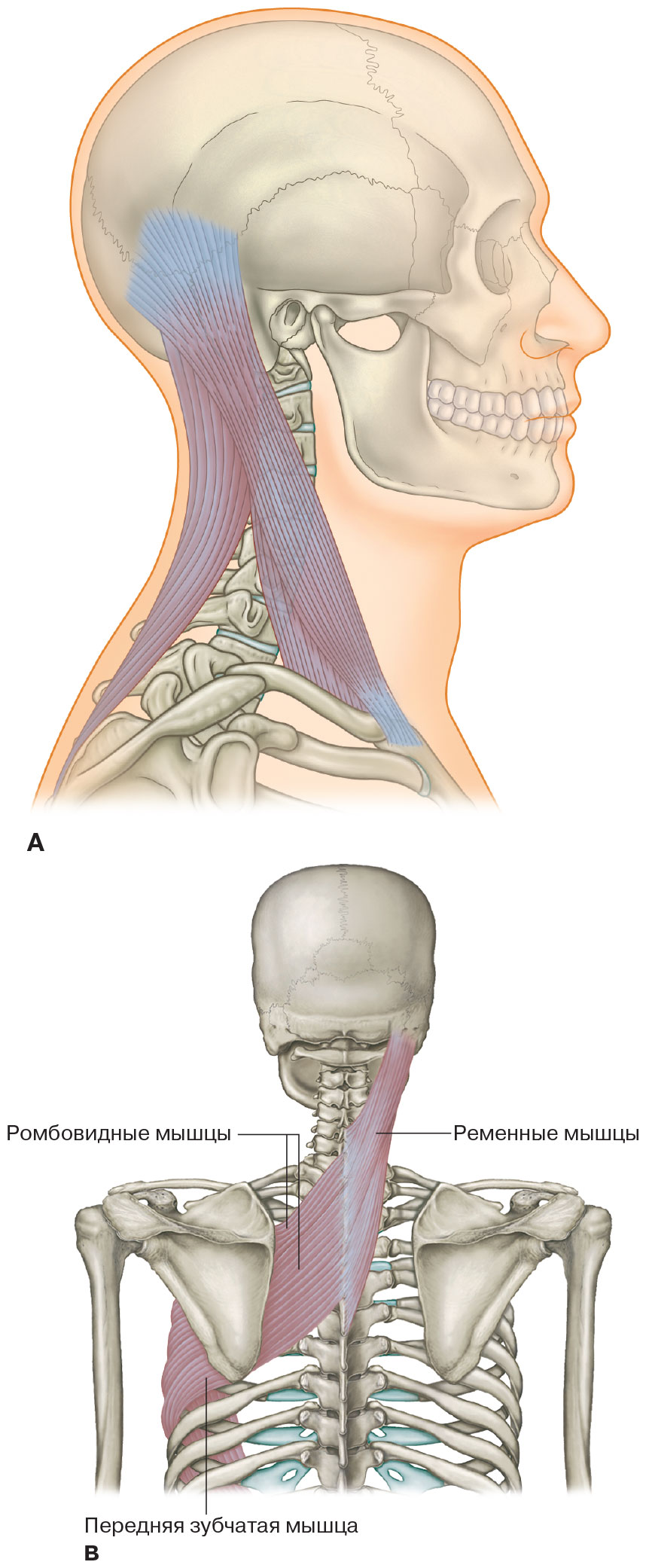Рис. 1.8. Если рассматривать ременную мышцу головы отдельно от всего тела, то очевидно, что она отвечает за поворот головы и разгибание в шейном отделе позвоночника. С функциональной точки зрения, она является частью Латеральной и Спиральной Линий и стабилизирует голову и глаза в моменты, когда человек бежит, охотится или наклоняется к детям