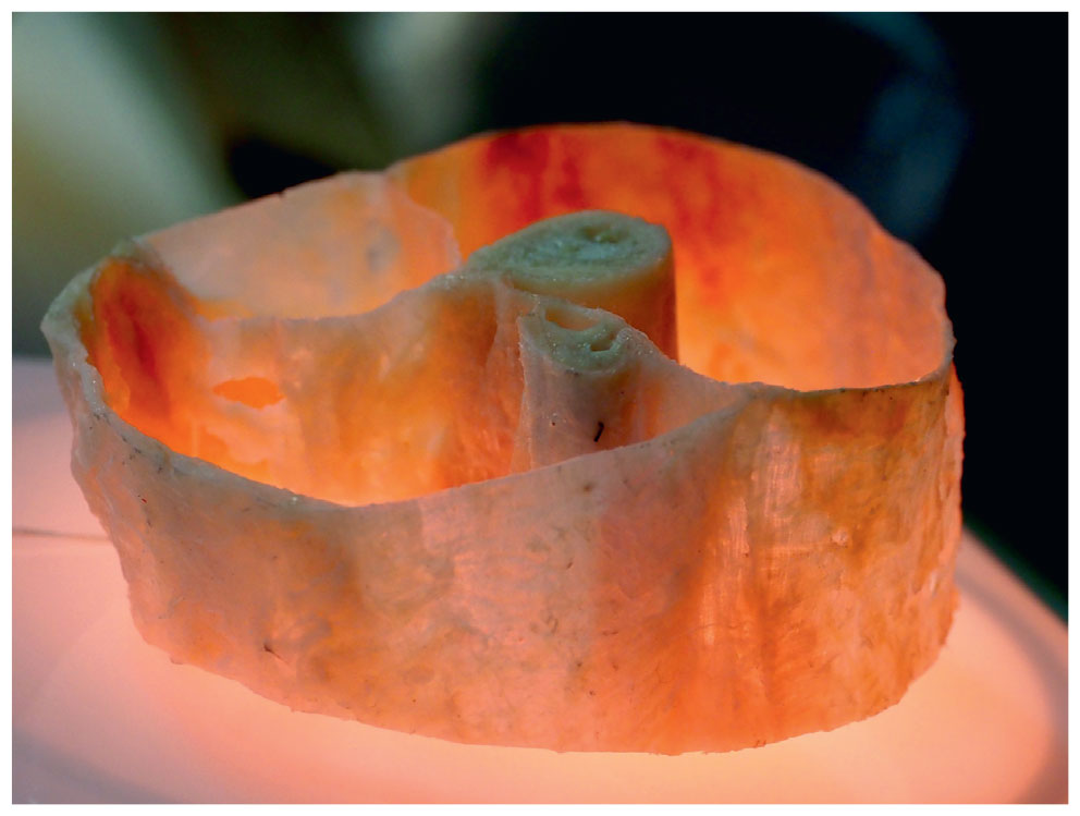 Рис. 1.7. Создать новую стратегию возможно, только если учитывать межфасциальные взаимосвязи. На фотографии – диссекция нижней части Спиральной Линии (см. Гл. 6). Она показывает, как, изменяя угол наклона скальпеля, можно продемонстрировать интегрированное действие не одной, а сразу нескольких миофасциальных единиц (мышц). Эта часть Спиральной Линии начинается на бедре (нижняя правая часть образца на фото), проходит под аркой стопы (левая часть образца на фото) и идет до седалищного бугра с двуглавой мышцей бедра (верхняя правая часть на фото). (Фото любезно предоставлено автором.)