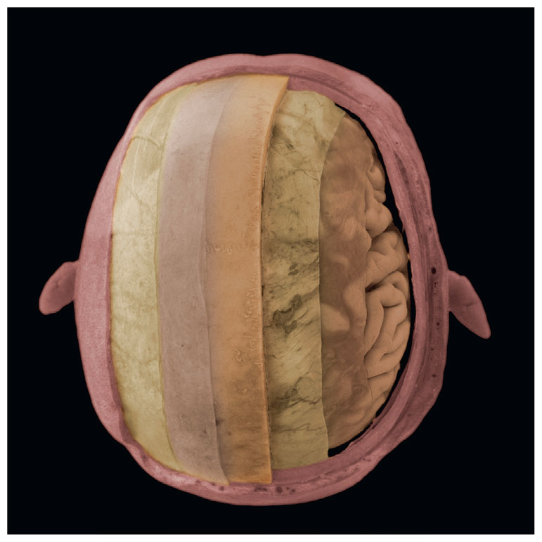Рис. 1.12. Фасциальная система часто изображается как многослойная. На этой фотографии диссекции черепа вы видите разные слои: от кожи вглубь к тонкому жировому слою, далее к сухожильному шлему, до рыхлого слоя. Именно он позволяет смещать кожу головы по кости или, фактически, по надкостнице черепа. Надкостница – это прочное фасциальное покрытие, окружающее каждую кость. Под ней показаны другие слои, окружающие и защищающие мозг. Хотя фасциальная многослойность в теле является очевидным фактом, следует отметить, что с гистологической точки зрения между слоями всегда существует некий переход. Лишь в сумках синовиальных суставов и полостях жидкостных каналов отсутствуют коллагеновые волокна. Иначе говоря, все эти отдельные слои связаны друг с другом передающими силу коллагеновыми волокнами. (Фото любезно предоставлено Science Photo Library.)