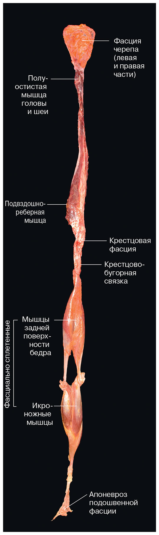 Рис. 1.13. Поверхностная Задняя Линия, которая была иссечена цельной Тоддом Гарсиа из Laboratories of Anatomical Enlightenment (www.LofAE.com). Ткани тела не были обработаны перед диссекцией. (Фотография любезно предоставлена автором. Обратите внимание, что видеоролик с пояснениями к этой фотографии можно найти на веб-сайте.)