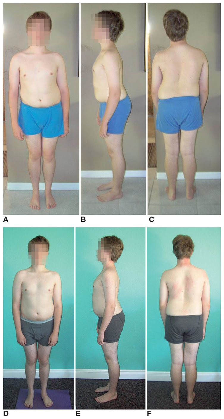 Рис. 1.14. Укороченность или смещение миофасциальных меридианов можно наблюдать в положении стоя или во время движения. Такая диагностика ведет к разработке глобальных стратегий лечения. Видите ли вы укорочение левой Латеральной Линии на изображении (А)-(C) и смещения фасциальной плоскости, особенно явные в области позвоночника и шеи, после лечения посредством Структурной Интеграции, на изображениях (D)-(F)? (www.anatomytrains.com – ссылка на видео: BodyReading, 101; объяснение линий см. в Главе 11.) (Фотографии любезно предоставлены автором.)