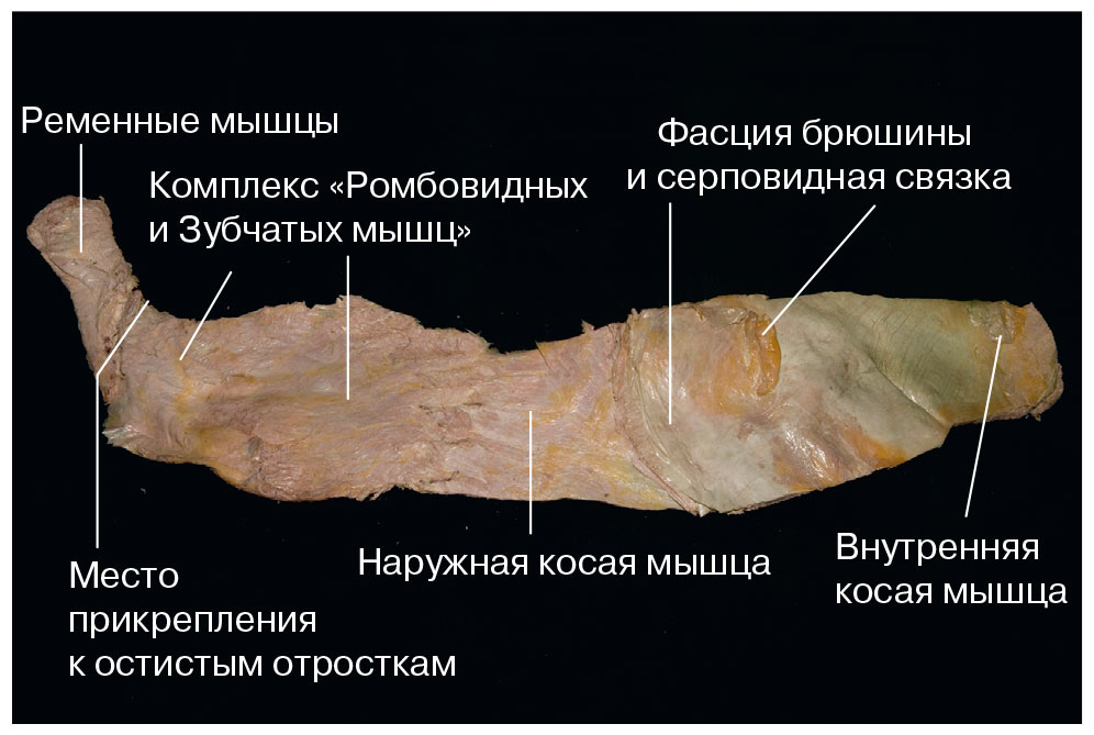 Рис. 1.16. Ременные мышцы шеи (слева) через остистые отростки соединяются с контралатеральными ромбовидными мышцами, которые, в свою очередь, прочно связаны с зубчатыми мышцами, и через фасции живота – с ипсилатеральной частью таза. Эти миофасциальные связи, которые, конечно, имеют зеркальное расположение на противоположной стороне, являются основой способности млекопитающих вращать туловище. Они подробно описаны в Главе 6, посвященной Спиральной Линии. (Фото любезно предоставлено автором.)