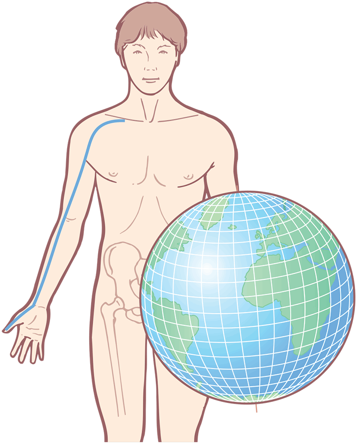 В акупунктуре слово «меридиан» часто используется для обозначения каналов, по которым проходит энергия в теле47–49. Во избежание путаницы следует подчеркнуть, что линии миофасциальных меридианов – это не акупунктурные меридианы, а линии натяжения и передачи усилия. Описание этих линий основывается на стандартах западной анатомии. Миофасциальные меридианы передают напряжение и упругую отдачу, тем самым способствуя движению тела и обеспечивая его стабилизацию. Очевидно, что они частично совпадают с меридианами акупунктуры, но они не эквивалентны (для сравнения см. Приложение 4). По мнению автора, слово «меридианы» ближе по смыслу к понятию меридианов широты и долготы, опоясывающих Землю (рис. 1.17). Подобно им, наши меридианы опоясывают тело, определяя географию и геометрию миофасции, геодезию подвижной тенсегрити тела.