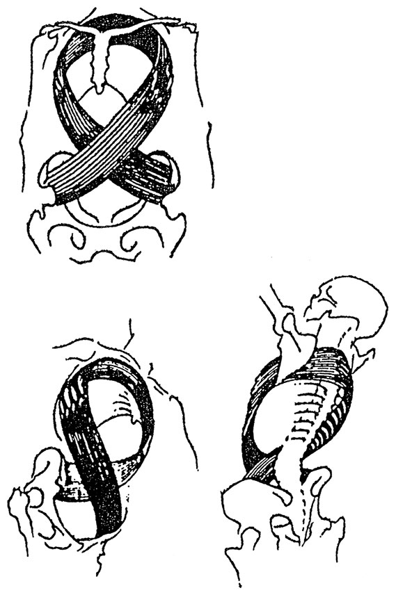 С момента публикации первого издания я также познакомился с работой Андре Флеминга и его коллег по «миофасциальным слингам» о силовом замыкании крестцово-подвздошного сустава61, 62. Особенно интересно клиническое применении этой работы, представленное несравненной Дайан Ли (рис. 1.28). Передний Косой Слинг и Задний Косой Слинг Флеминга в целом совпадают с Функциональными Линиями, описанными в Главе 8. А вот Задний Продольный Слинг, исследуемый Флемингом, является частью того, что в данной книге описывается как гораздо более длинная Спиральная Линия (см. Гл. 6). Как уже указывалось ранее, эта дерзкая книга, которую вы держите в руках, опережает рецензируемые исследования, такие как исследования Флеминга и Ли, и предлагает вам точку зрения, которая, похоже, хорошо работает на практике, но еще не подтверждена научно-обоснованными публикациями38.