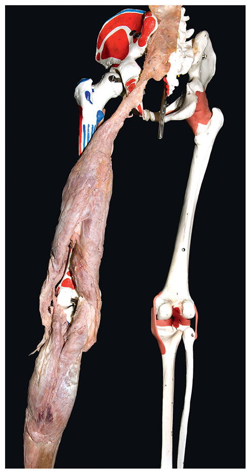 Рис. 1.19. Мышцы задней поверхности бедра имеют четкую непрерывающуюся фасциальную связь с волокнами крестцово-бугорной связки. Существует также фасциальная непрерывность между дистальными сухожилиями мышц задней поверхности бедра и головками икроножных мышц, но это соединение часто разрезают и редко показывают на изображениях. (Фото любезно предоставлено автором; диссекция выполнена Лабораторией Анатомического Просвещения.)