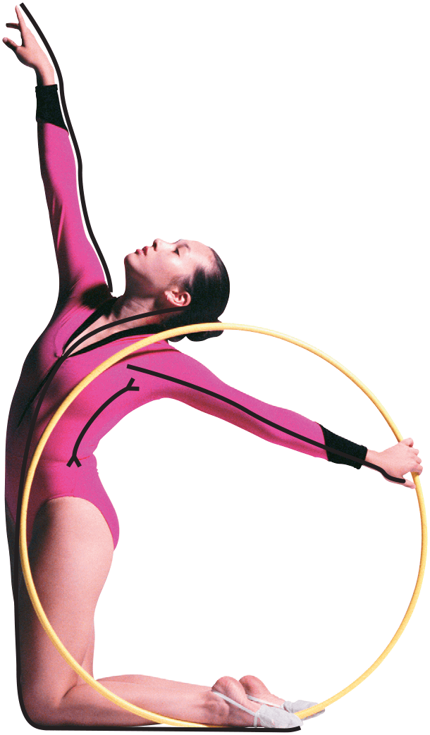 Рис. 1.24. Линии в действии в спорте – см. Главу 10. На этой фотографии Поверхностная Фронтальная Линия находится в тонусе, она удлинена и растянута за счет прогиба в спине, согнутого колена и подошвенного сгибания стопы. Поверхностная Задняя Линия руки поддерживает правую руку в воздухе, а Глубинная Фронтальная Линия руки на левой руке растягивается от ребер до большого пальца. Латеральная Линия с левой стороны туловища сжата, а с противоположной стороны, наоборот, открыта