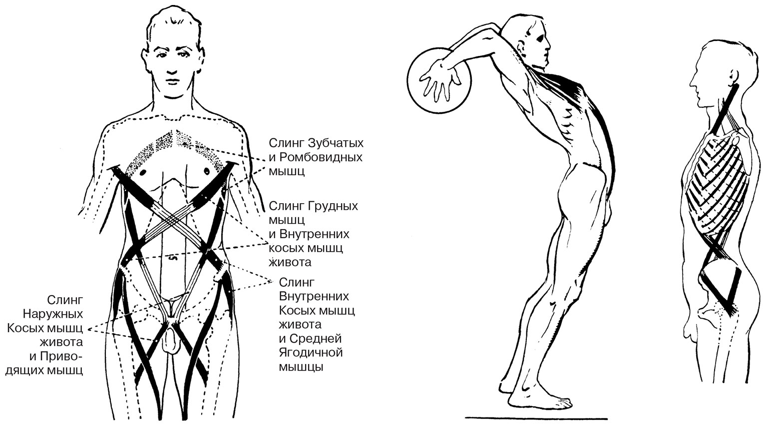 Рис. 1.27. Немецкий анатом Курт Титтель также изобразил несколько невероятно атлетичных тел, прорисовав на них функциональные мышечные связи. Разница заключается в том, что эти мышечные функциональные связи, также встречающиеся в работах Françoise Mézière и др., являются кратковременными и специфическими для конкретного движения, в то время как в Анатомических поездах речь идет о фасциальных «тканевых» соединениях, которые являются более постоянными и постуральными. (Из Tittel 1956, с любезного разрешения Urban и Fischer.)