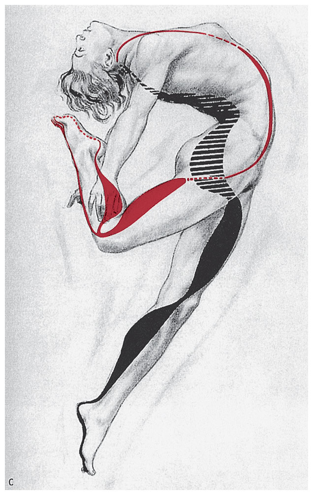 Рис. 1.26. Немецкий анатом Хёпке подробно описал некоторые «миофасциальные меридианы» в своей книге 1936 года, которая переводится на английский как «Игра мышц». Менее точные, но похожие идеи можно найти в «Пластической анатомии» Мольера (опубликовано Bergmann, Мюнхен; 1938). (Воспроизведено с любезного разрешения Hoepke H, Das Muskelspiel des Menschen, Штутгарт; G Fischer Verlag, 1936, с любезного разрешения Elsevier.)