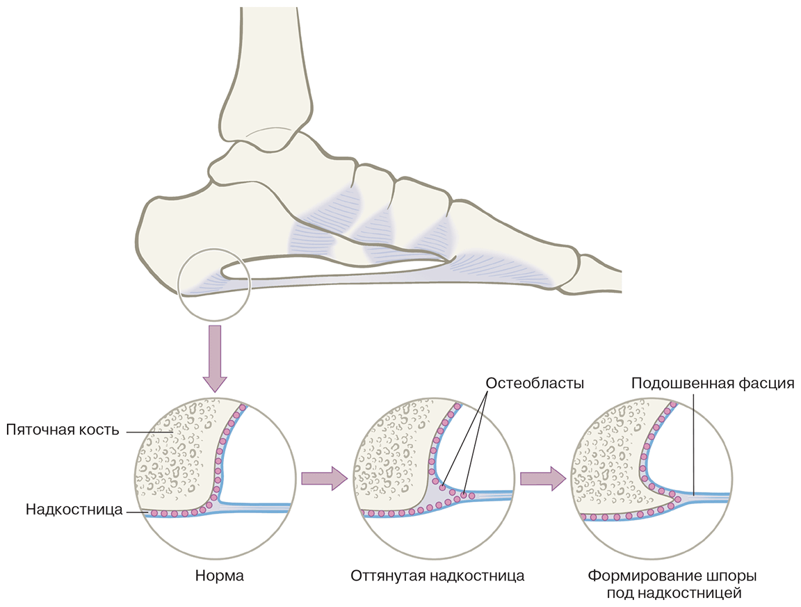 Между надкостницей и костью находится множество остеобластов – костеобразующих клеток. Эти клетки постоянно строят и ремоделируют внешнюю поверхность кости. В процессе первичного формирования кости и для поддержания ее здоровья остеобласты, следуя заложенной в них программе, заполняют сумку надкостницы. Клиенты, создающие повторяющееся напряжение в подошвенной фасции, рискуют с большой вероятностью заработать подошвенный фасциит на любом участке подошвенной фасции, где она может разорваться и воспалиться. Если вместо этого надкостница пяточной кости, уступая натяжению, отделяется от пяточной кости, остеобласты заполняют образовавшуюся под надкостницей «палатку», тем самым создавая костную шпору. Сама шпора и процесс ее образования вполне естественны и по своей природе не болезненны; боль возникает, если шпора оказывает давление на чувствительный малоберцовый нерв, что часто и происходит.