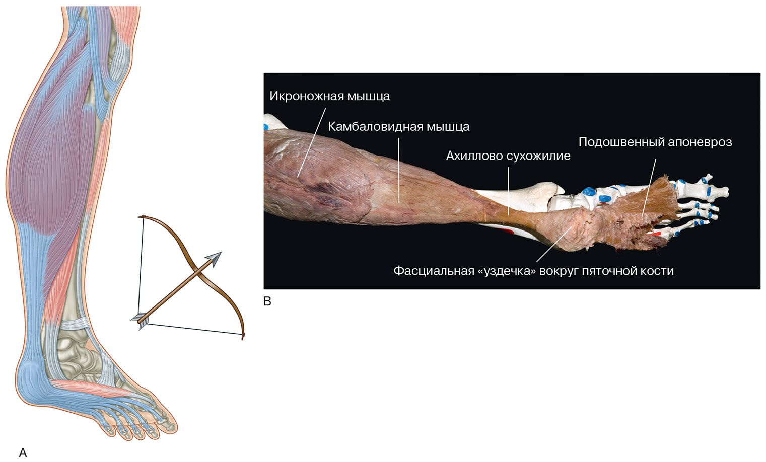 Рис. 3.15. При чрезмерном напряжении миофасциальной непрерывности в нижнем отделе ПЗЛ пяточная кость выталкивается внутрь голеностопного сустава, как стрела, выпущенная натянутой тетивой лука (A). Обратите внимание, что фасция вокруг пятки действует, как «уздечка» или «чашка», охватывающая и контролирующая пяточную кость (В)