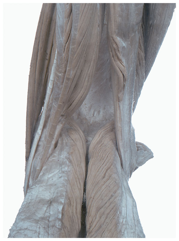 При сравнении рис. 1.1A с рис. 3.17 легко увидеть, что икроножная мышца и мышцы задней поверхности бедра одновременно и разделены, и соединены. При диссекции видно, что прочная ареолярная фасция явно соединяет дистальные концы мышц задней поверхности бедра с проксимальными концами головок икроножных мышц. На рис. 3.17 эти ткани были удалены, а на рис. 3.3 они сохранены. Долгое время ареолярную ткань считали просто пассивным «наполнителем», но теперь не вызывает сомнения, что в натянутом состоянии она эффективно передает силы1.
