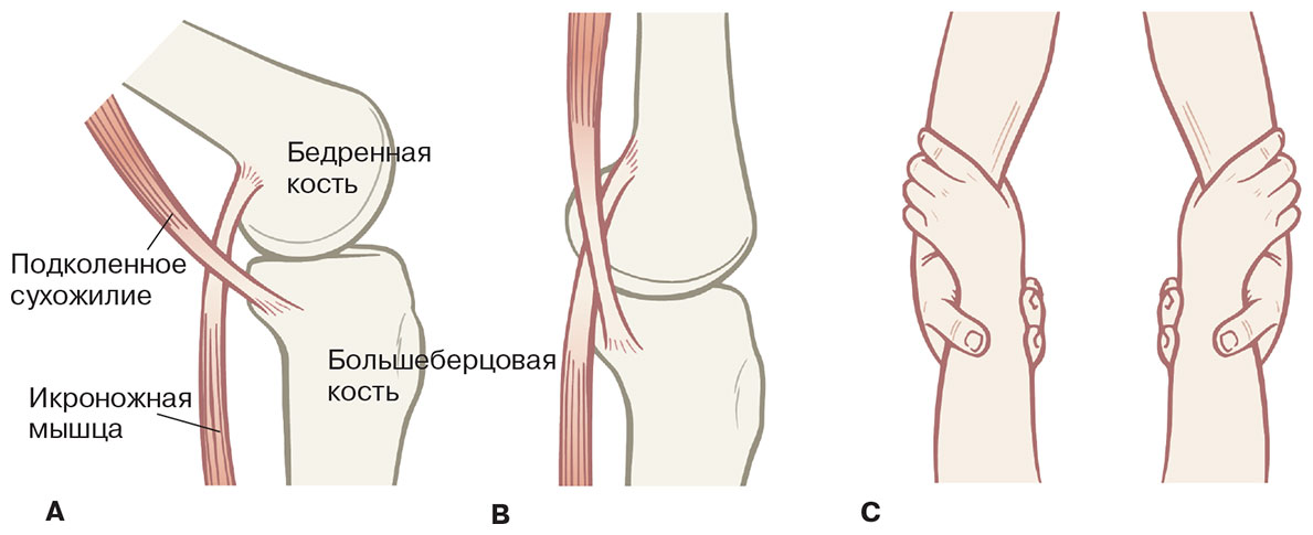 На практике при сгибании коленей мышцы задней поверхности бедра и икроножные мышцы разъединяются. И хотя, согласно строгим правилам Анатомических поездов, они не являются миофасциальной непрерывностью, при разогнутом колене эти мышцы действительно функционируют как единое целое. Головки икроножных мышц идут вверх, огибая сухожилия мышц задней поверхности бедра, и прикрепляются к верхним частям мыщелков бедренной кости. Мышцы задней поверхности бедра спускаются вниз, огибая икроножные мышцы, и крепятся к большеберцовой и малоберцовой костям. Пока колено согнуто, эти две миофасциальные единицы идут своими путями, остаются соседями, но имеют слабую связь (рис. 3.18A). Однако, когда коленный сустав начинает разгибаться, мыщелки бедренной кости растягивают сухожильный комплекс, соединяя эти элементы между собой и обеспечивая их совместное функционирование, подобно двум парам рук, держащим друг друга за запястья (рис. 3.18B – С). Такая конфигурация очень похожа на двойной узел, который ослабляется при сгибании колена и туго натягивается при его выпрямлении.