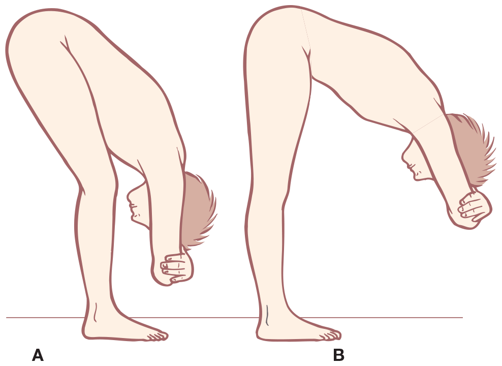 Для выполнения простого, но показательного теста, наглядно демонстрирующего взаимосвязи внутри всей ПЗЛ, попросите вашего клиента наклониться вперед к прямым ногам, как если бы он хотел коснуться пальцев ног (рис. 3.10). Обратите внимание на двусторонний контур спины и положение рук в покое. Обратите внимание вашего клиента на то, какие ощущения он испытывает вдоль всей задней части тела с каждой стороны.