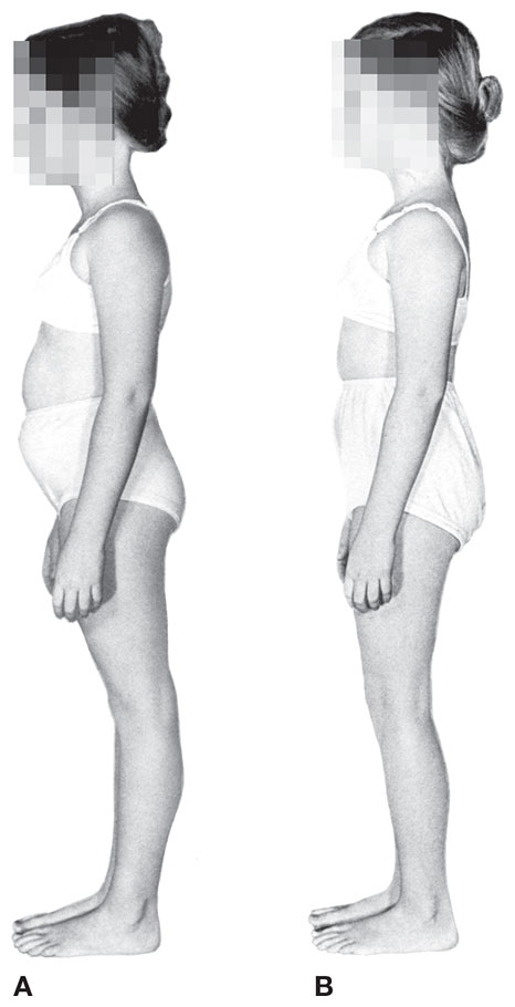 Рис. 3.33. В терминологии Анатомических поездов переразогнутые колени можно рассматривать как проблему вторичного изгиба. (А) До лечения: вторичный изгиб изменил свою направленность и превратился в первичный, что привело к дополнительной нагрузке на остальные вторичные изгибы – в данном случае, на поясничный и шейный отделы позвоночника. (В) После проведения Структурной Интеграции изгиб коленей нормализовался, а вслед за ним – и остальные вторичные изгибы (Из Toporek (1981), воспроизведено с любезного разрешения Robert Toporek (www.newbabymassage.com)).7