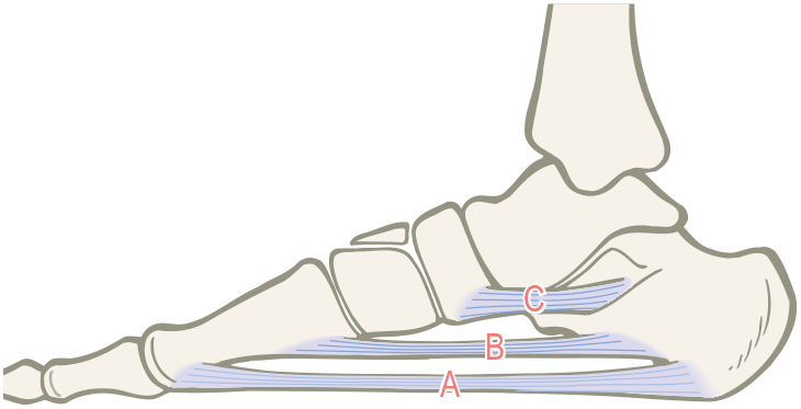 Рис. 3.34. Подошвенная фасция (А), по сути, является лишь самым поверхностным из нескольких слоев миофасции стопы. Другие слои включают в себя длинную подошвенную связку (В) и пяточно-ладьевидную связку (С), которые обеспечивают поддержку аркам (сравните с Рис. 3.9)