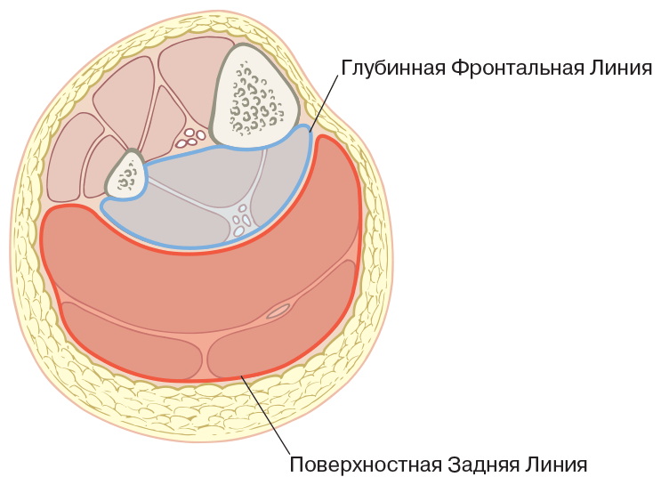 Рис. 3.35. ПЗЛ занимает весь поверхностный задний отдел голени. Как это ни парадоксально, глубокий задний отдел голени относится не к Глубинной Задней Линии, а к Глубинной Фронтальной Линии