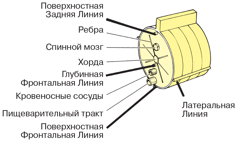 Рис. 3.36. Расположение кардинальных линий на обобщенной схеме тела позвоночных. Обратите внимание, что ПЗЛ проходит позади позвоночника, в то время как Глубинная Фронтальная Линия проходит прямо перед позвоночником, а Поверхностная Фронтальная Линия – перед внутренними органами. С самого начала эволюции позвоночных симметрия между левой и правой сторонами опорно-двигательного аппарата не сопровождалась симметрией между передней и задней частями