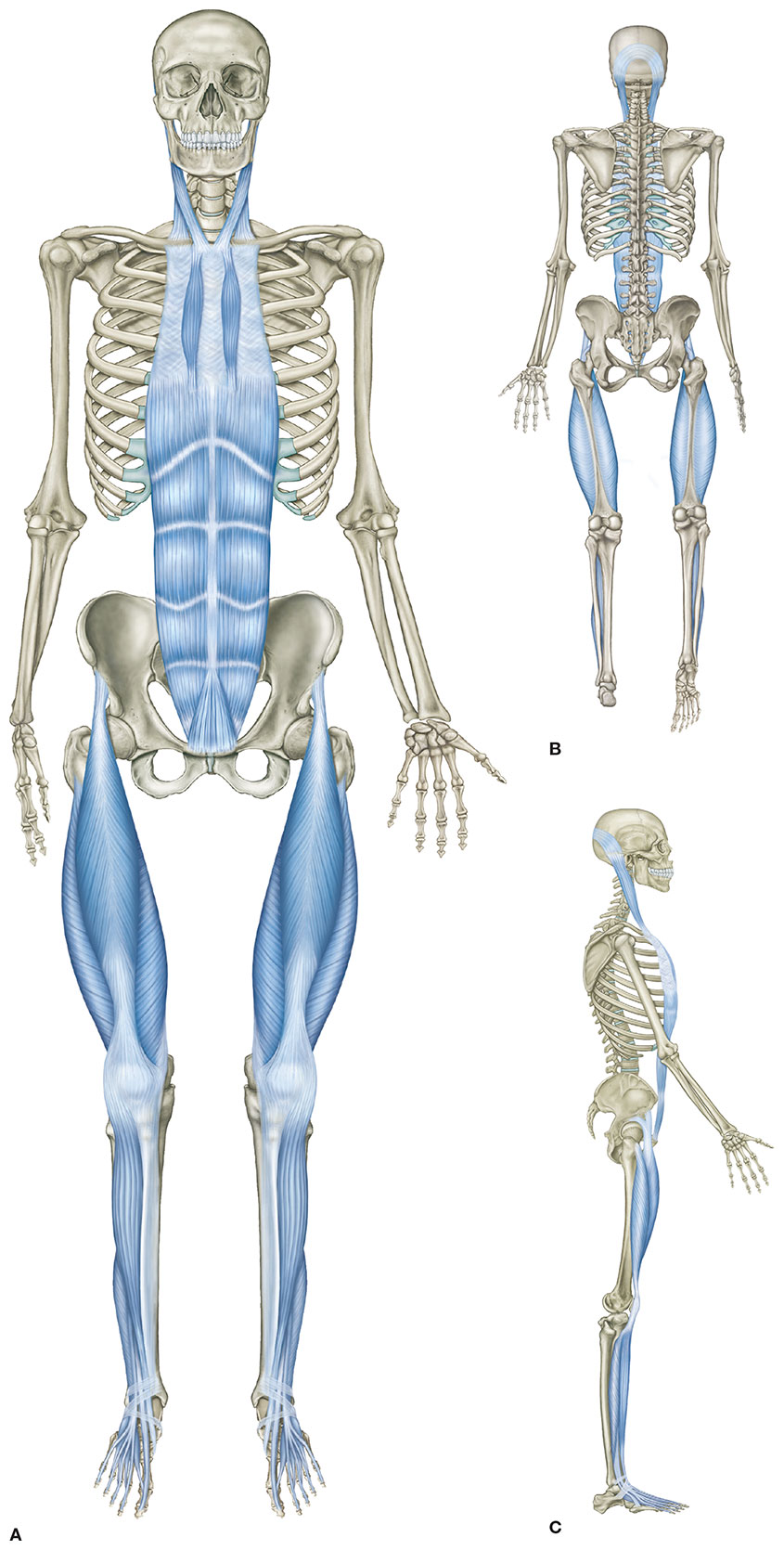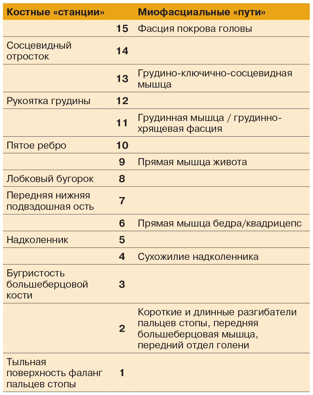 Рис. 4.1. Поверхностная Фронтальная Линия: миофасциальные «пути» и костные «станции» (рис. 4.2)