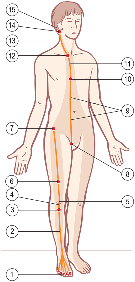 ПФЛ начинается с тыльной стороны пальцев стоп. Согласно принципу действия фасции, который гласит, что «все связано со всем», технически ПФЛ соединяется с ПЗЛ через надкостницу вокруг кончиков фаланг пальцев стопы, но эта связь не оказывает никакого специфического влияния на тело. С функциональной точки зрения, эти две линии Анатомических поездов противостоят друг другу: ПЗЛ отвечает за сгибание пальцев ног, а ПФЛ – за их разгибание, и аналогичным образом происходит во всем остальном теле. Рассматривая функцию этих мышц в поддержании осанки, можно сказать, что тыльные сгибатели удерживают комплекс большеберцовой и малоберцовой костей от слишком большого движения назад в подошвенное сгибание, а подошвенные сгибатели предотвращают их чрезмерный наклон вперед в тыльное сгибание.