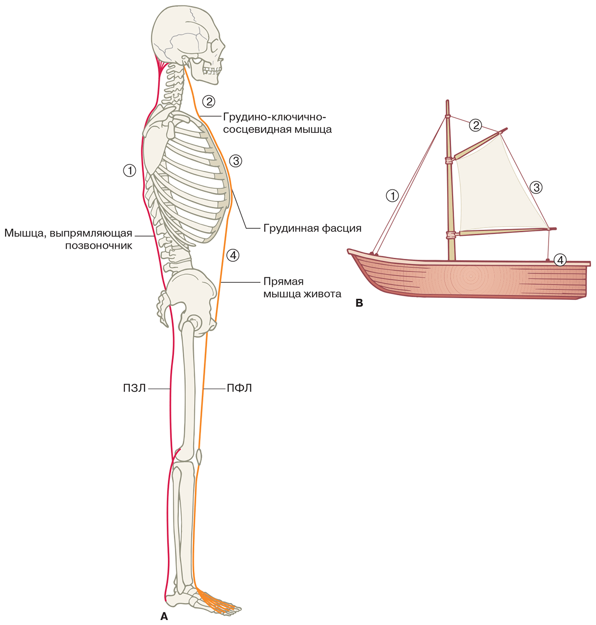 Рис. 4.4. Между ПЗЛ и ПФЛ происходит реципрокное взаимодействие, подобное такелажу парусной лодки. ПЗЛ предназначена для того, чтобы создавать натяжение по задней стороне тела вниз, а ПФЛ – чтобы создавать натяжение по передней стороне тела вверх (согласно Mollier1)