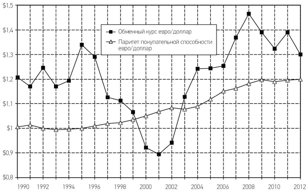 Примечание. В 2012 году евро стоил 1,3 доллара по текущему обменному курсу, но 1,2 доллара по паритету покупательной способности.